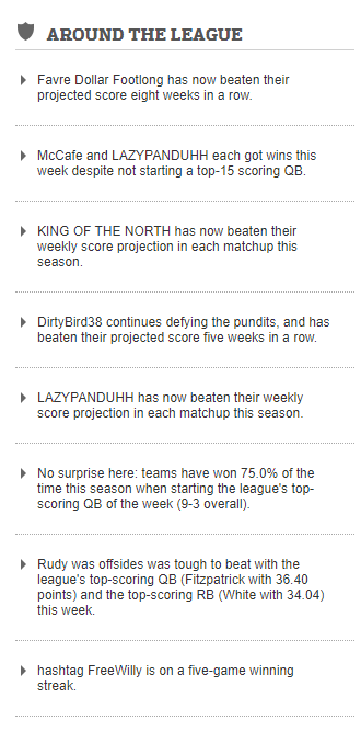 LAZYPANDUHH got 20.83 points from Jacoby Brissett (319 Pas Yds, 1 TD/2 Int) to sneak by Primetime Playmakers 135.63 to 130.57. LAZYPANDUHH took a 19.41-point lead on Thursday and never looked back. LAZYPANDUHH gets revenge for a Week 4 loss (229.41 to 164.66) and improves to 1-1 this season against Primetime Playmakers. With Brandon Allen delivering zero points for LAZYPANDUHH, the margin could have been bigger. LAZYPANDUHH (2-11, 1,845.51 points) remains mired in last place and Primetime Playmakers (7-6, 2,161.04 points) stays in fifth place.